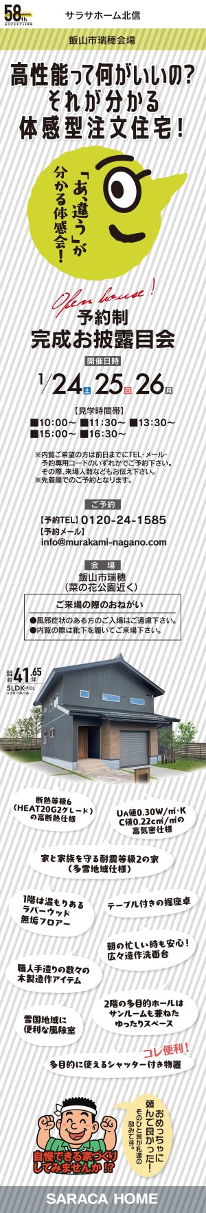 須坂市日滝会場で、エアコン1台で暖かい高性能ハウスの完成見学会を開催致します。さらに新春キャンペーンとして特別企画をご用意してお待ちしております。