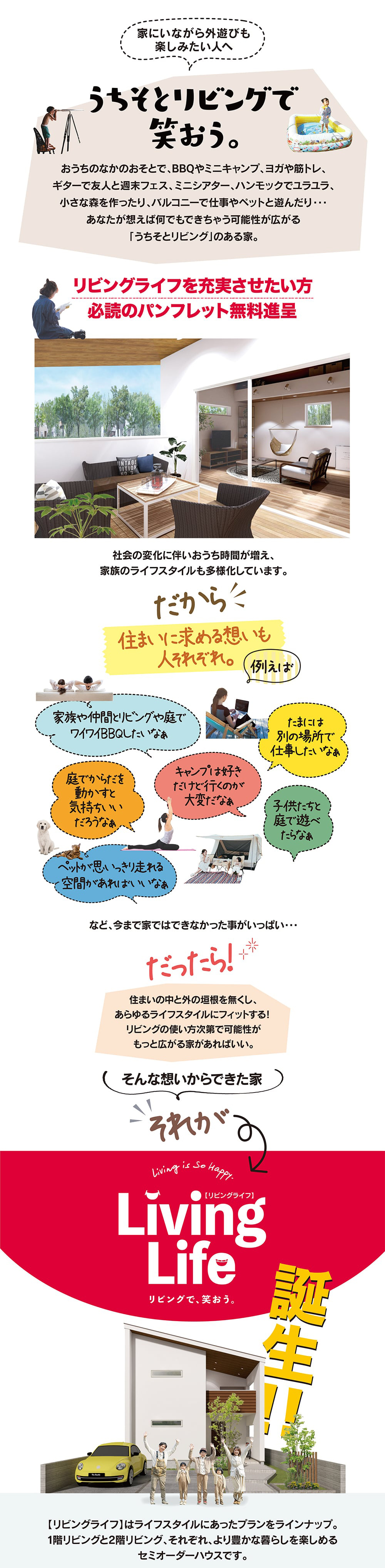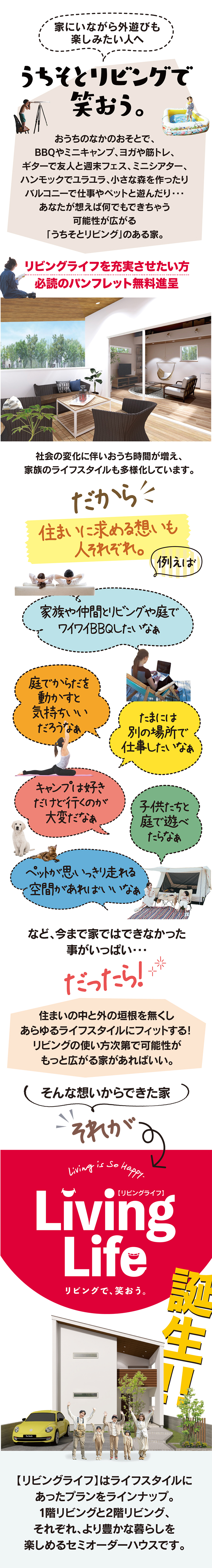 暮らし方の可能性が広がる家【リビングライフ】が誕生。自分らしい家づくりをお考えの方にパンフレットを差し上げます。まずはお気軽にお問い合わせ下さい。